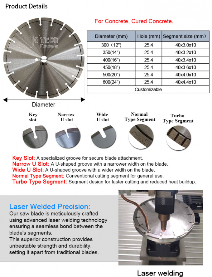2. Informações de especificação da lâmina de serra turbo diamantada de 500mm para concreto curado com boa eficiência